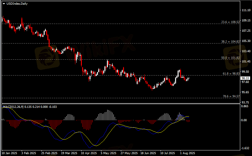 日线图显示美元指数反弹上行,当前仍承压于98.80阻力。从MACD来看,快慢线呈平行,红色动能柱温和增量。指数走势和动能柱的变化呈分歧。