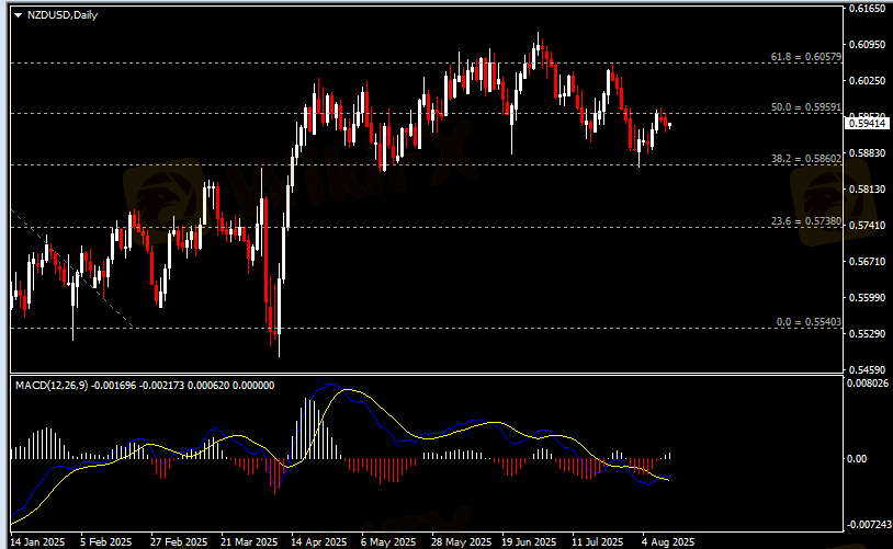 日线图显示纽元兑美元回调下挫,当前承压于0.5960阻力。从MACD来看,快慢线金叉依旧,白色动能柱温和放量。汇价走势和动能柱的变化呈分歧。