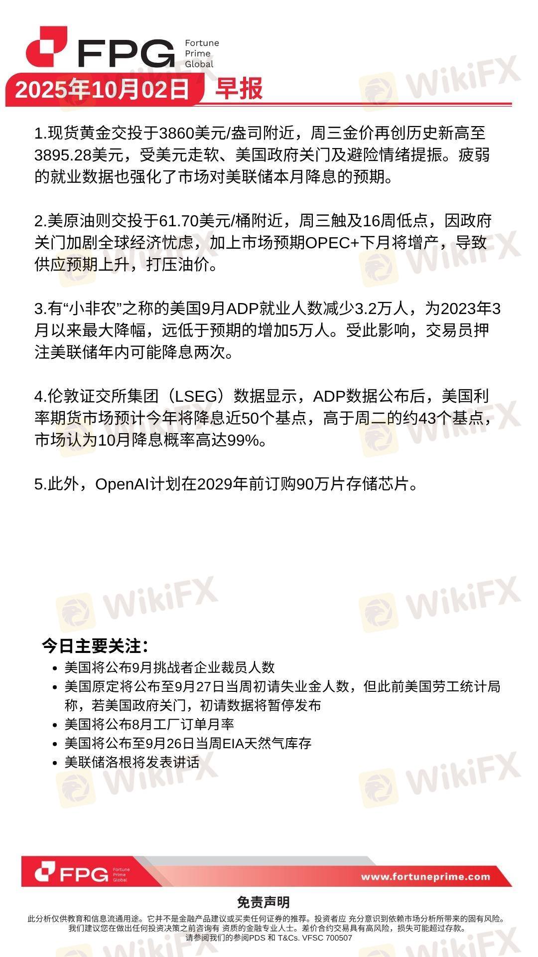 🟡 黄金逼近3900美元现货黄金交投于 $3860/盎司,盘中最高升至 $3895.28,创历史新高。上涨原因包括: 美元走软,美国政府关门,避险需求上升,就业数据疲软,强化降息预期🛢️ 原油大跌至16周低美原油跌至 $61.70/桶 附近,创16周新低,因: 政府关门引发经济担忧 + OPEC+ 预计增产,供应压力上升📉 “小非农”远低预期美国9月ADP就业减少 3.2万人,为2023年3月以来最大降幅,市场原预期为增长 5万人。📊 降息预期升温市场预计今年降息 近50个基点(前值43)📆 10月降息概率高达 99%💻 OpenAI 将大规模采购芯片OpenAI 计划在 2029年前 订购 90万片存储芯片,加大技术布局。