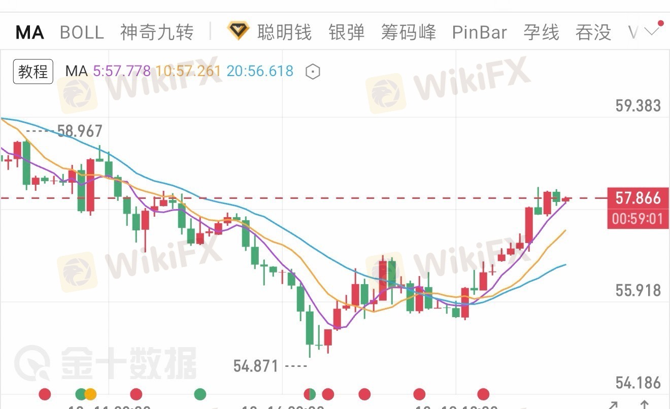 1小时级别中,油价保持波段上涨的走势,均线多头排列为价格提供了有力支撑,且已成功突破58.00这一关键压力位,早盘阶段在高位区间窄幅震荡休整;MACD指标在零轴上方形成死叉并向下运行,这意味着多头动能虽未完全耗尽,但已经出现了明显的减弱迹象。综合来看,当前短线趋势依旧由多头主导,日内操作建议遵循顺势做多的思路。