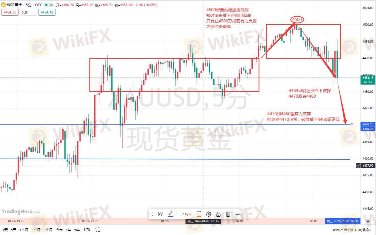 1. 阻力位:4500是核心整数心理阻力,图表标注明确该位置站稳需形成强力支撑,短期多头若无持续动能,此关口将成为本轮反弹的天花板;4484为当前短期阻力,是价格回调后的首个承压位,反弹至此易触发抛压。
