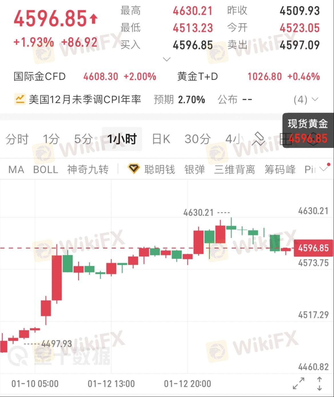 近期走出了一波强势拉升,从4497美元一路冲高至4630美元后,目前处于高位震荡回调阶段。