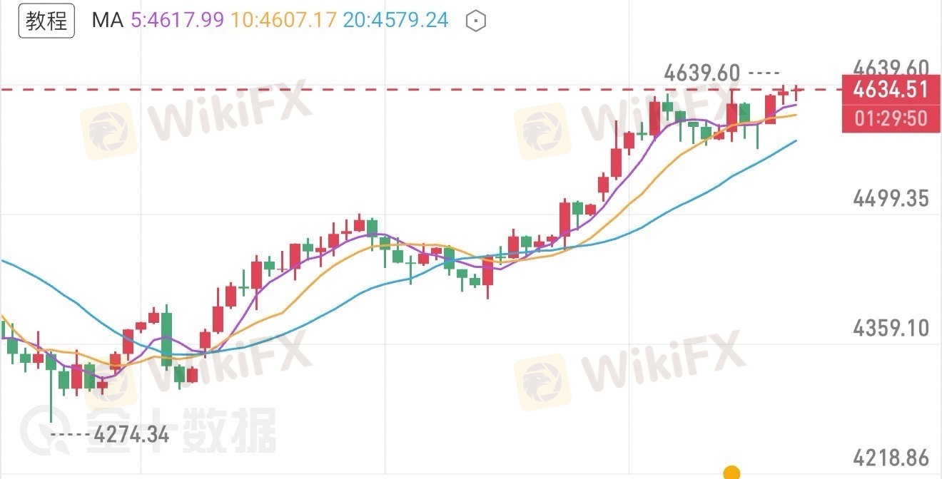 技术面日线级别:虽今日收阴终结三连阳,但均线呈多头排列,5日均线4550区域是关键支撑,守住则震荡偏强格局不变。上方阻力聚焦日内高点4635附近,突破则有望向4662等更高位推进。