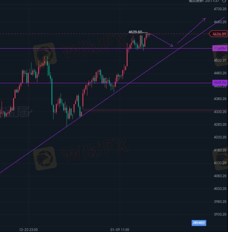 今日操作核心思路依旧围绕低多展开,但需警惕短期技术性调整风险。下方核心支撑区域锁定昨日低点4570-4580区间,该区间同时也是近期多空博弈的关键分水岭,一旦有效下破,行情或将触发深度回调行情。