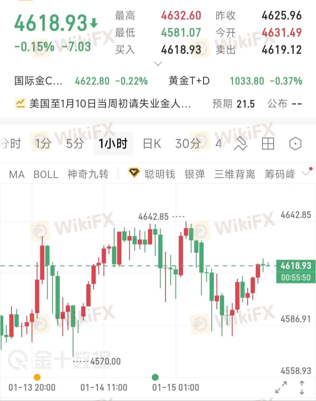日内小幅震荡下行,整体维持在4580-4645的区间内波动,今晚21:30将公布美国当周初请失业金人数,市场预期21.5万人,前值为20.8万人,这一数据将直接影响市场对美联储3月降息的预期,是今晚黄金短线波动的核心驱动因素,在关键数据公布前,市场情绪可能提前发酵,需警惕主力资金借数据洗盘。数据公布后,黄金可能出现“跳空”行情,务必设置好止损,避免大幅回撤。