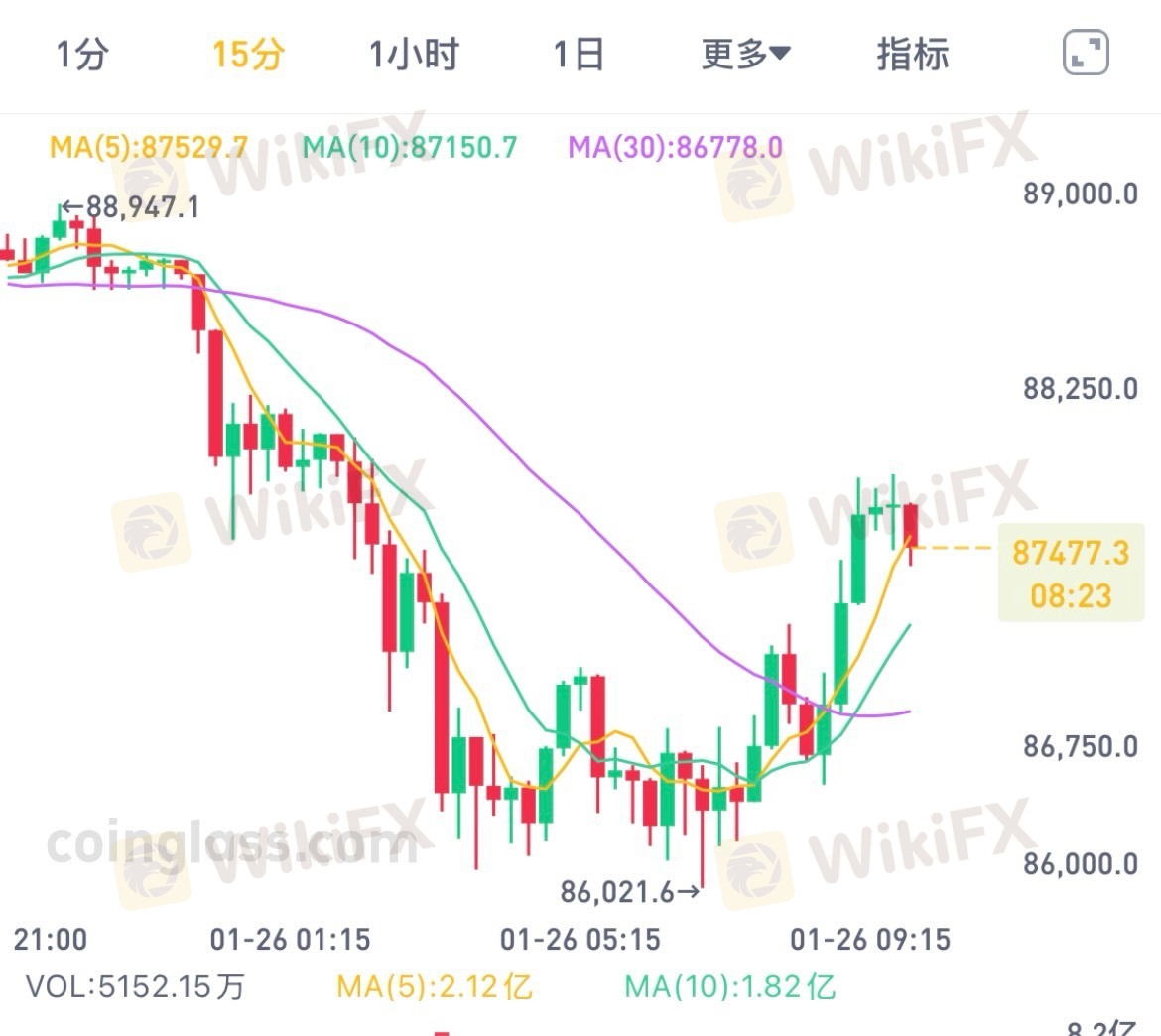 凌晨出现一波快速下探,直接回落约三千点,来到八万六附近。从走势来看,目前多头的反击力度略显不足。