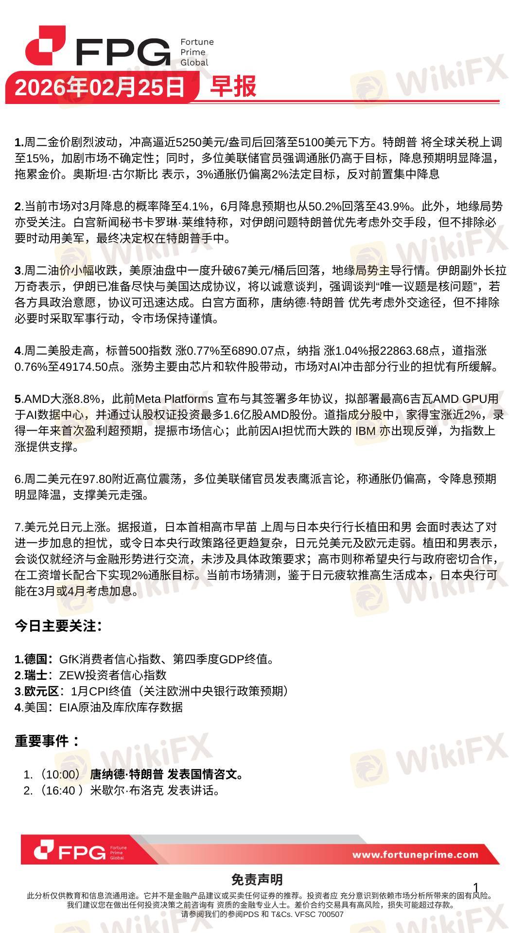 1️⃣ 黄金冲高回落:周二金价一度逼近5250美元/盎司,但很快回落至5100美元下方。特朗普宣布全球关税上调至15%,加剧市场不确定性;多位美联储官员重申通胀高于目标,降息预期降温。奥斯坦·古尔斯比指出,3%通胀仍偏离法定2%目标,反对提前集中降息。2️⃣ 降息预期骤降:市场对3月降息的概率降至4.1%,6月降息预期也从50.2%回落至43.9%。同时,地缘局势持续牵动市场。白宫新闻秘书卡罗琳·莱维特表示,特朗普对伊朗优先外交手段,但必要时不排除动用美军。3️⃣ 油价小幅回落,地缘局势主导:美原油盘中曾突破67美元/桶,后回落。伊朗副外长拉万奇表示,伊朗已准备尽快与美国达成核协议,只要各方有政治意愿,协议可迅速达成。白宫重申优先外交途径,但军事选项仍在保留。4️⃣ 美股强势反弹:标普500涨0.77%至6890.07点,纳指涨1.04%报22863.68点,道指涨0.76%至49174.50点。芯片和软件股引领涨势,市场对AI冲击部分行业的担忧缓解。5️⃣ 重磅消息推动股市:AMD大涨8.8%:Meta Platforms宣布签署多年协议,将部署最高6吉瓦AMD GPU于AI数据中心,并通过认股权证投资最多1.6亿股AMD股份。家得宝涨近2%:录得一年内首次盈利超预期,提振市场信心。IBM反弹:此前因AI担忧下跌的IBM亦回升,为指数上涨提供支撑。6️⃣ 美元强势震荡:美元在97.80附近高位震荡,美联储鹰派言论支撑美元走强,降息预期降温。7️⃣ 日元走弱:美元兑日元上涨。日本首相高市早苗上周与日本央行行长植田和男会面,表达对进一步加息的担忧,可能令政策路径复杂化。市场猜测,日本央行可能在3月或4月考虑加息,以应对日元疲软推高的生活成本。#热点事件 #成为券商评测官 #ECInvestingInsights #BrokerReview #LearningCenter #xauusd #黄金外汇 #btc