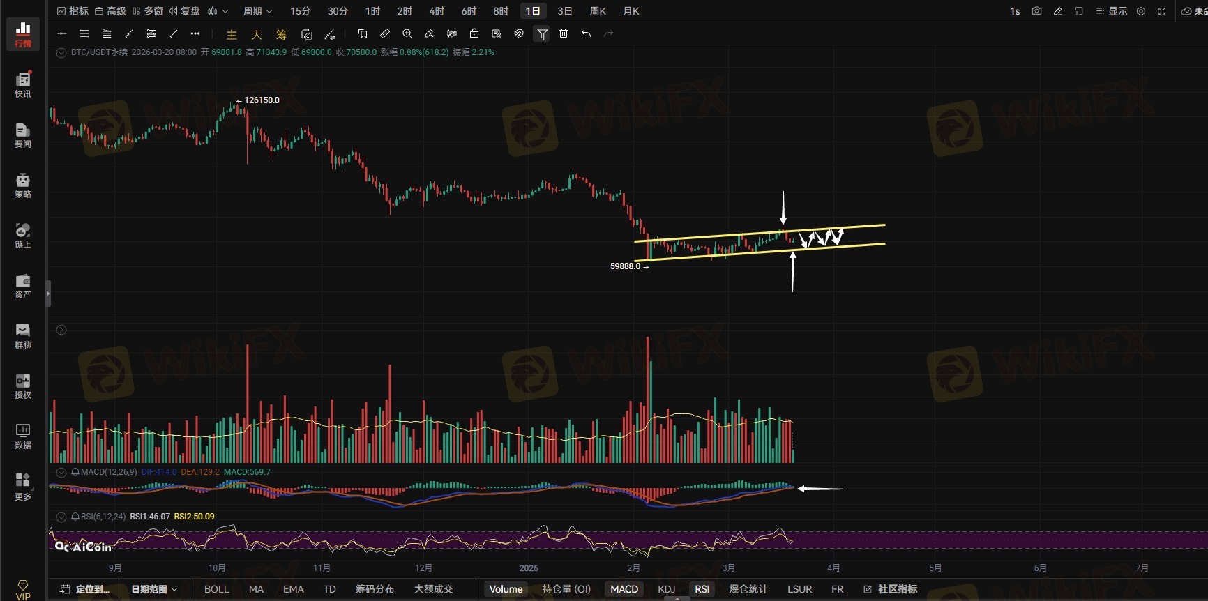 若行情走弱并跌破70408支撑,将下探69809颈线位,此位置为本轮回调极限支撑;一旦失守,69809至71342的反弹结构将被破坏,后续需关注69203及前期低点支撑,若持续破位,68214将成为下一目标位。