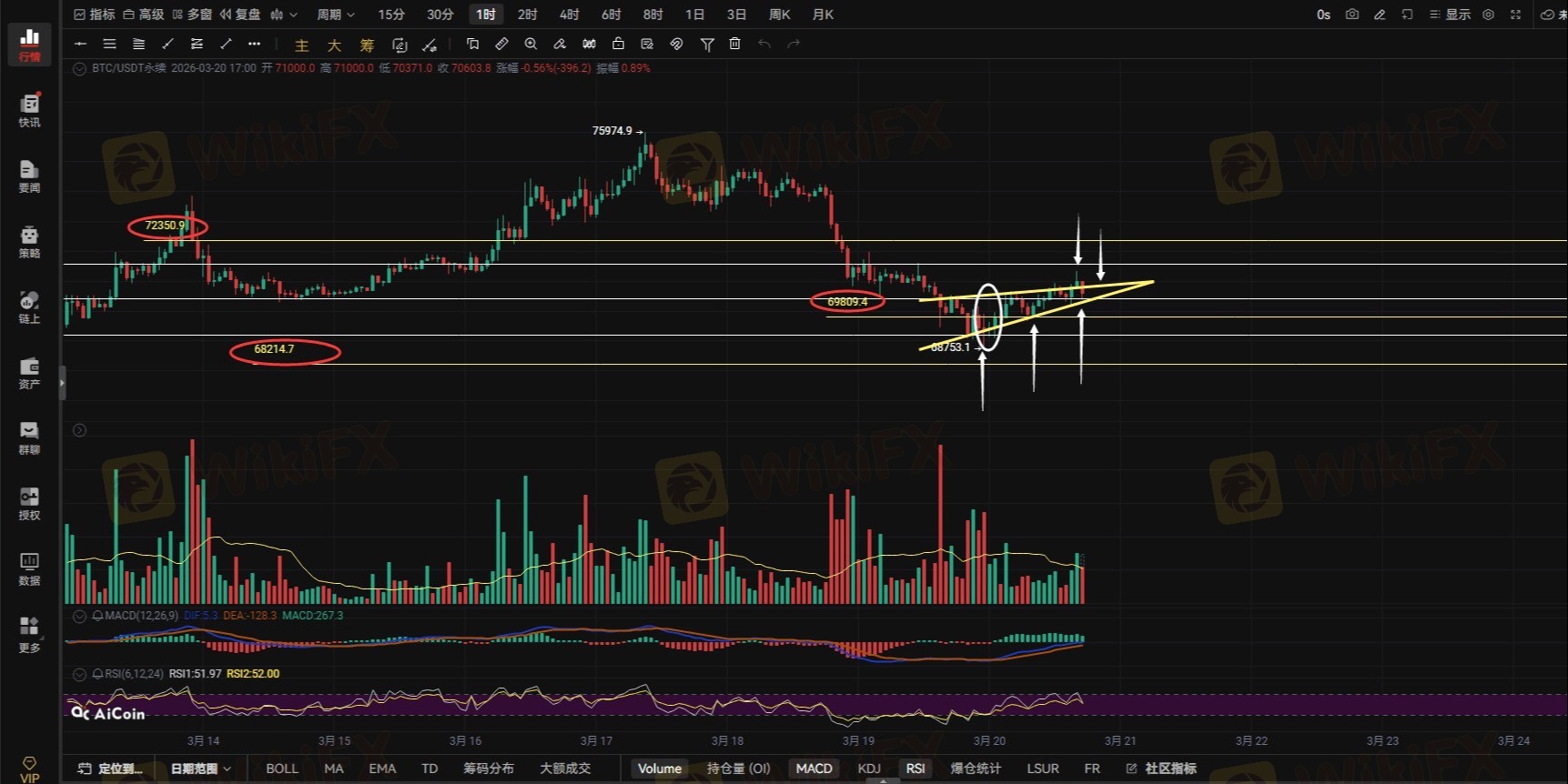 本轮反弹并非无迹可寻,前期白框区域收出变异启明星形态,奠定反弹基础;随后价格在70408遇阻,回踩69809确认支撑有效后,才走出71342这波反弹行情,逻辑清晰可循。
