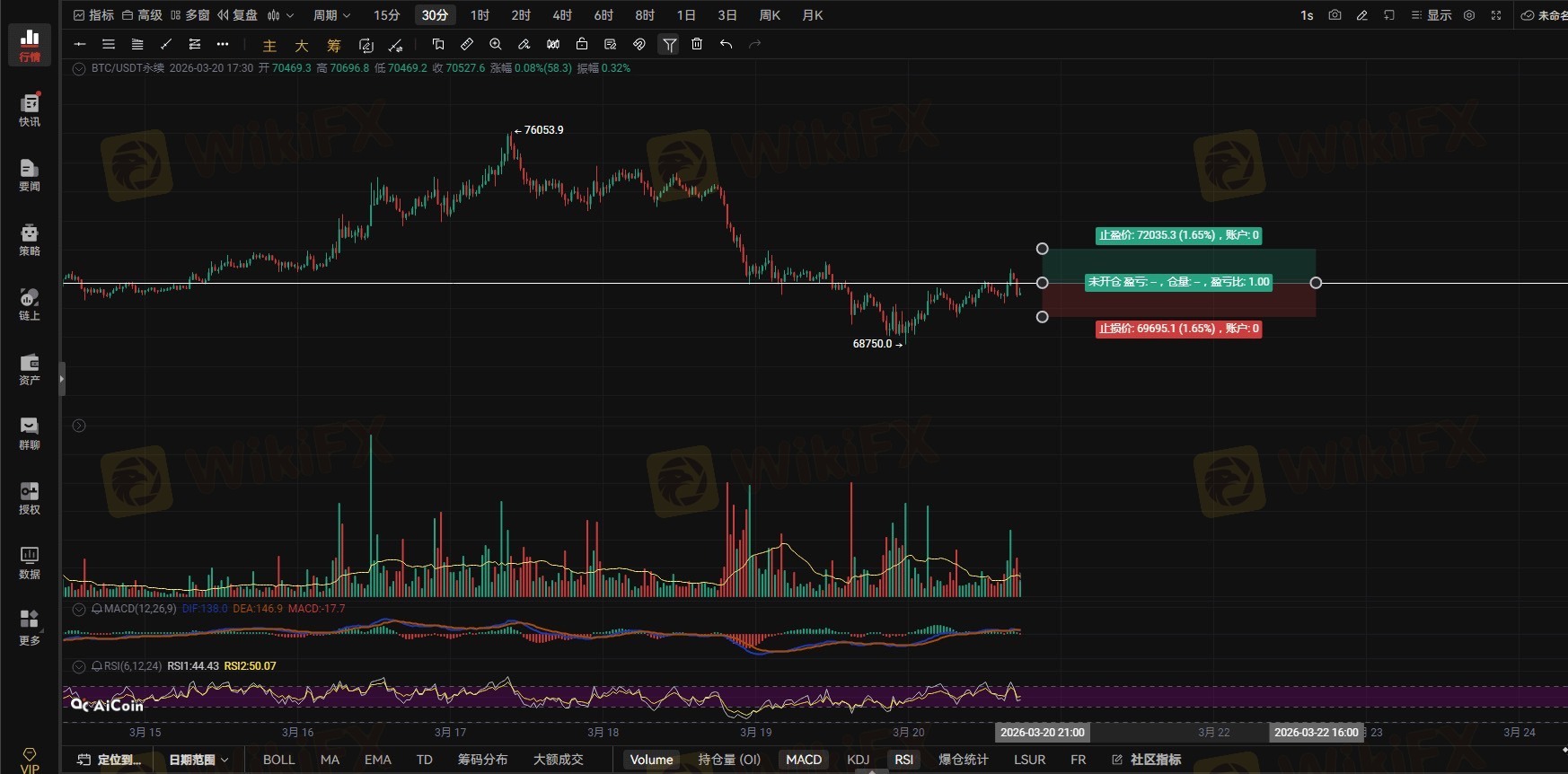 • 放量跌破70033且反弹无法收回,可右侧追空,严格带好止损。