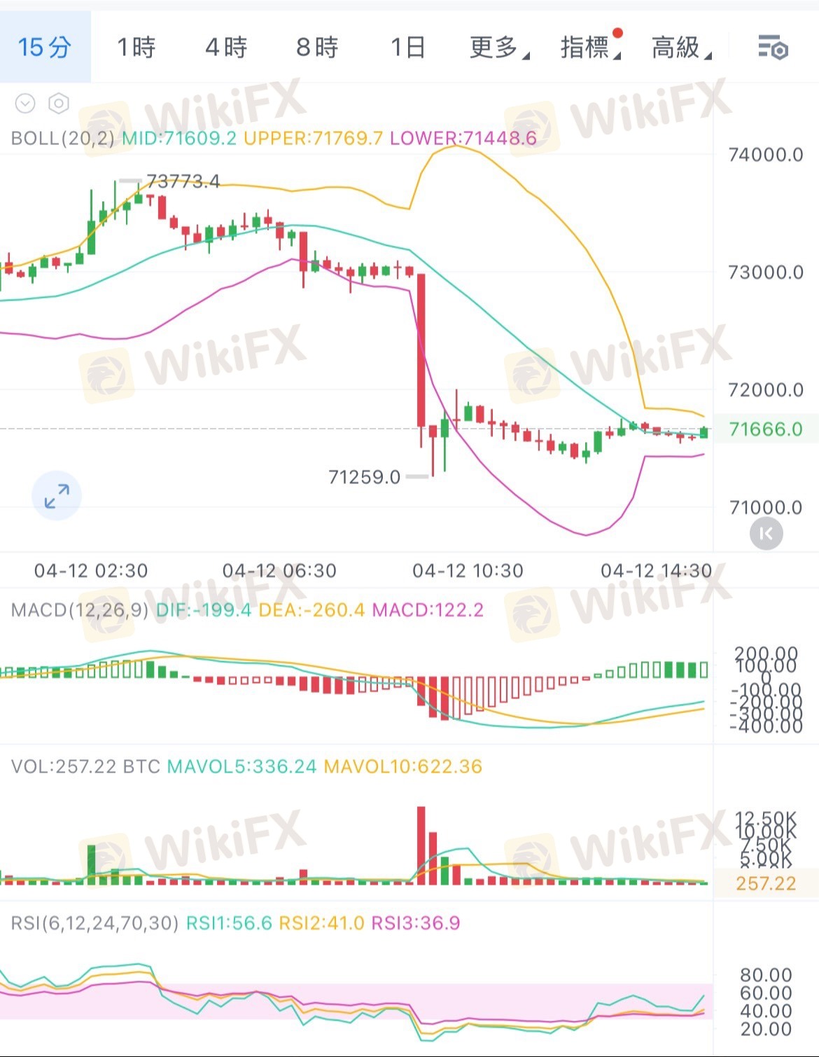 大饼在15分钟周期里,沿布林上轨一路冲高至73790高点后,出现明显的高位滞涨+量能衰竭,随后被大阴线砸破布林中轨,快速回落并插针至71310附近收回。