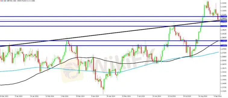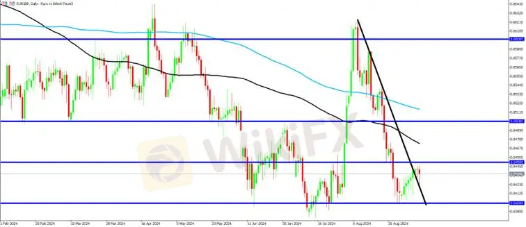 欧元/英镑本周从0.84水平上涨,并突破了下降趋势线。价格回调至下降趋势线寻找支撑,并可能继续上涨至0.85枢轴。