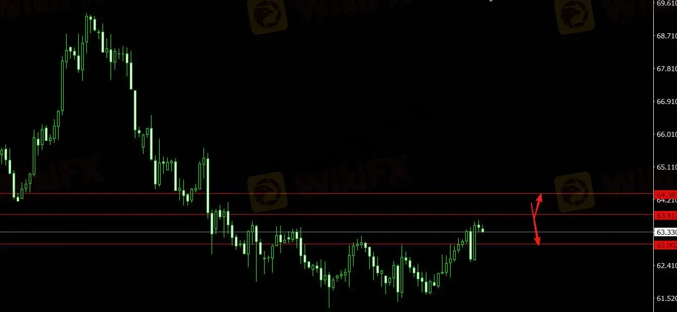 美元指数受支撑,原油承压,关注支撑位63.010,4小时看多至64.380;关注压力位63.820,4小时看空至62.620。