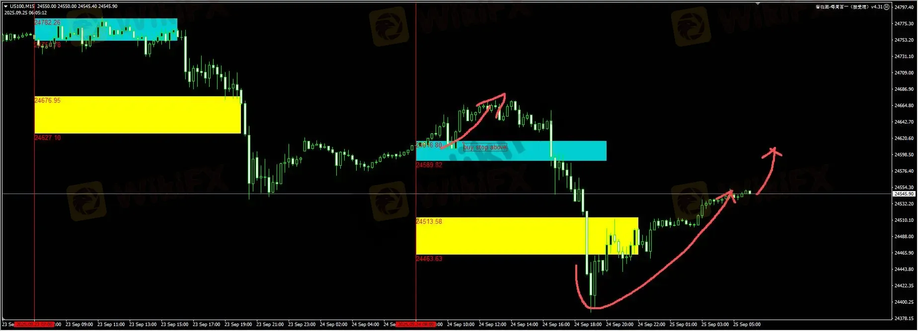 纳指:昨天我们插件明确提醒突破蓝色需要抓一波buy stop;另外,下扫黄色之后,需要在回升重回到24513进行buy stop操作。目前这2波操作都有不错的效果。日内我们建议,如果价格进一步反弹,对隔夜黄色回升的买单进一步保护。后续理想入场还是在扫荡24300-24400区域后,找机会buy stop。详细位置请咨询插件。