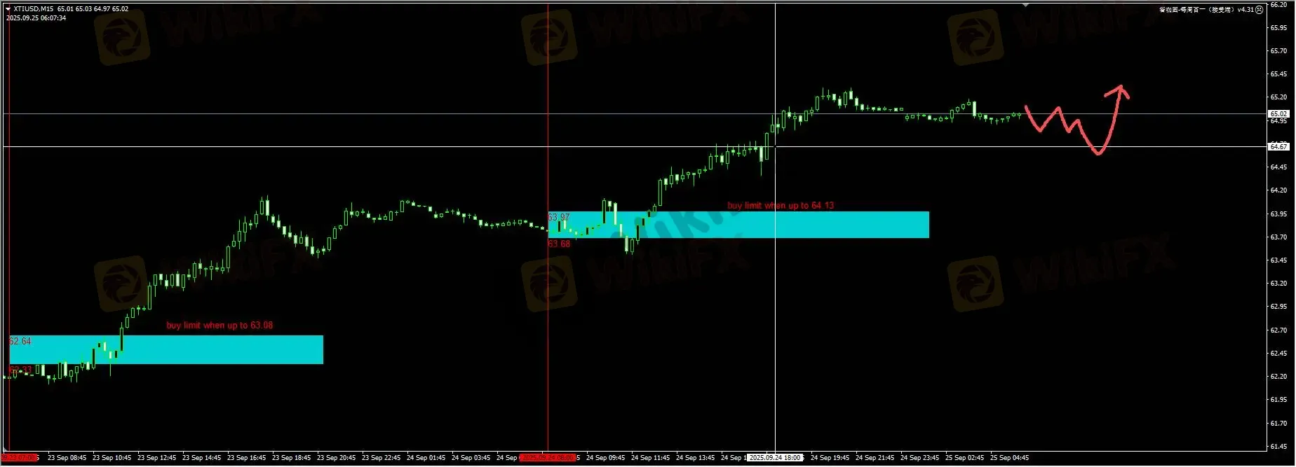 原油:昨天价格突破蓝色区域,同时也突破至64.13上方,但没有出现回踩走势,因此蓝色区域挂单没有入场。日内我们继续观察价格是否在回踩64.50附近水平能出现再次的企稳反弹信号。详细位置请咨询插件。