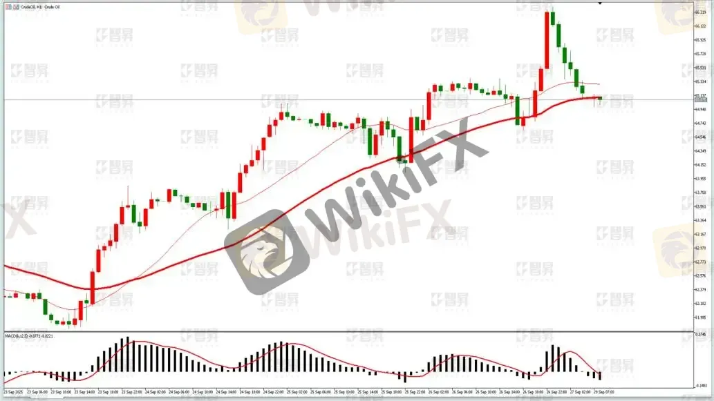 日线上,上一个交易日行情冲高回落且收长上影线K线,短期警惕油价下行风险。日内关注上方65.37美元一线压力,下方关注63美元一线支撑。