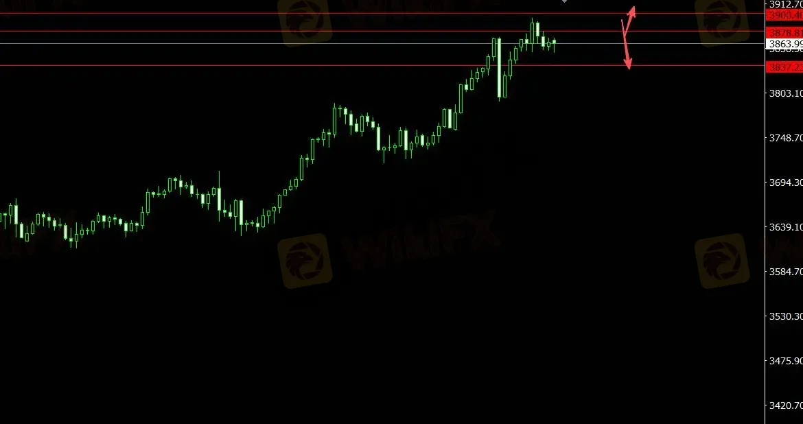 美元指数承压,黄金下跌。关注支撑位3837.20,4小时看多至3900.40,关注压力位3878.80,4小时看空至3820.50。