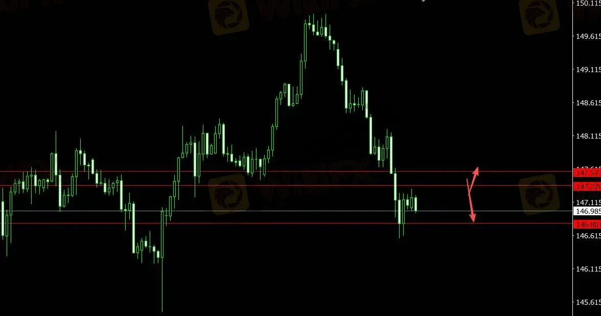 美元指数承压,日元下跌,关注支撑位146.800,4小时看多至147.580;关注压力位147.370,4小时看空至146.470。