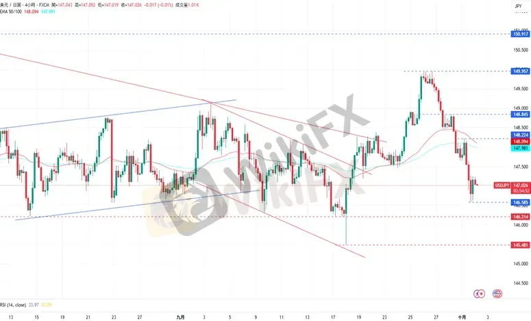 摘要:美元/日币(USDJPY):新闻事件:周三,美元/日元下跌至147.043日元。美元方面,由于美国政府正式停摆,劳工统计局等机构暂停运营,本周五原定发布的9月非农就业报告将延迟发布。经济数据方面,美国9月ADP就业人数减少3.2万人,大幅不及市场预期的增加5万人,前值也从5.4万人修正为-0.3万人。美国9月标普全球制造业PMI终值为52,与前值相符。日本方面,当日公布的数据显示,第三季度短观大型