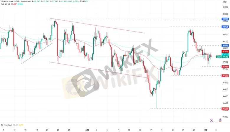 CPT Markets分析师指出,美元指数在回落至EMA50均线后受其负面压力,职续保持在其下方盘整。上涨方面,美元指数目前的阻力为9月29日的高点98.086,再来是9月26日的高点98.628。下跌方面,美元指数目前的支撑为10月01日的低点97.467,接着是9月23日的低点97.202水平。