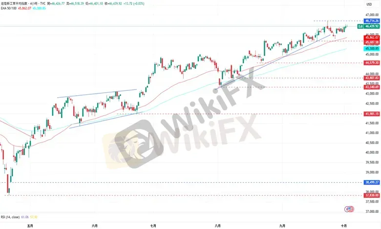 受下方EMA50均线支撑,道琼指数稳定的上涨。上涨方面,道琼指数目前的阻力为9月23日高点46714点,再来是47000点水平。下跌方面,道琼指数接下来的支撑为9月26日低点45785点,接着为9月10日低点45380点。