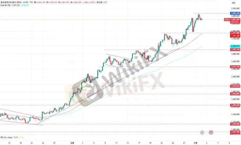 周三,黄金价格上涨至3865.77美元,盘中一度创下3895.33美元的历史新高。因民主党与共和党未能就短期支出计划达成协议,美国联邦政府于美东时间周三凌晨0点正式停摆。这导致劳工统计局等机构暂停运营,本周五原定发布的9月非农就业报告因而延后发布。经济数据方面,美国9月ADP就业人数减少3.2万人,大幅不及市场预期的增加5万人,前值也从5.4万人修正为-0.3万人。ISM制造业PMI从8月的48.7上升至9月的49.1。展望后市,周四美国经济日程将公布当挑战者企业裁员人数、周初请失业金人数以及工厂订单月率。