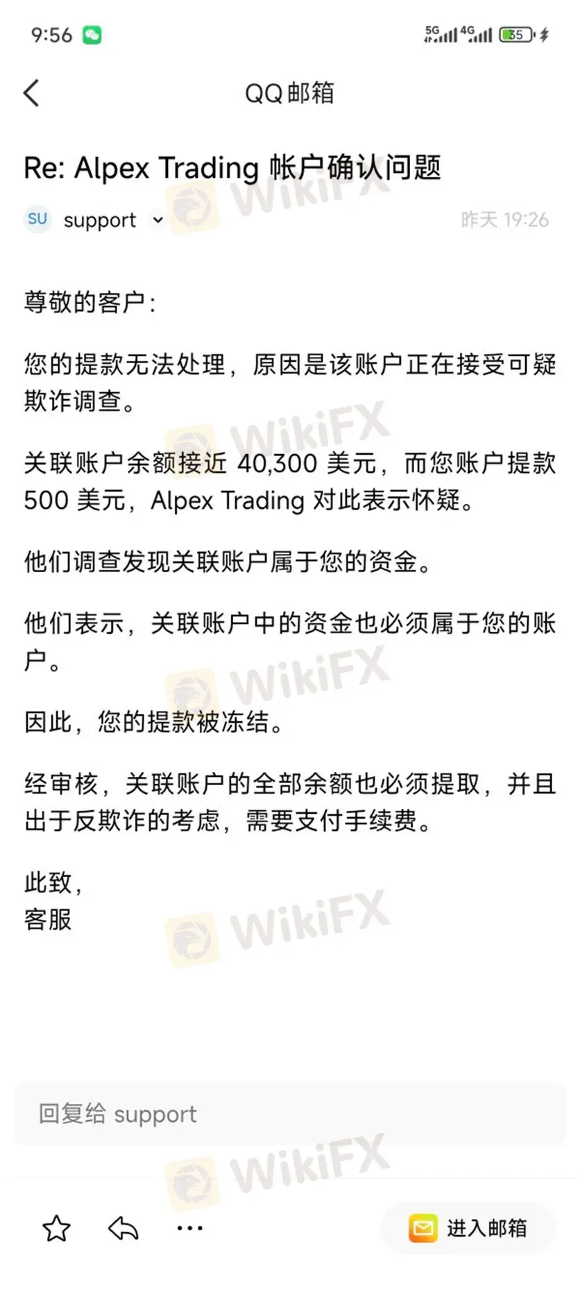 Alpex Trading回复的邮件称:“您的提款无法处理,原因是该账户正在接受可疑欺诈调查。关联账户余额接近40,300美元,而您账户提款500美元, Alpex Trading对此表示怀疑。因此,您的提款被冻结。”