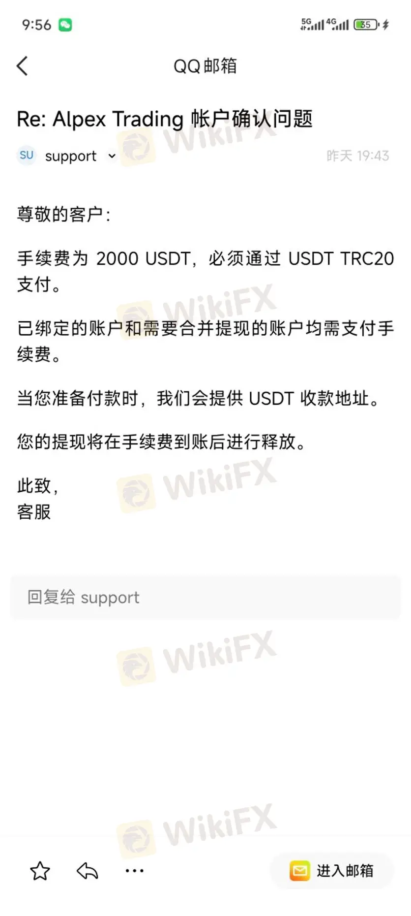 Alpex Trading 更进一步,用户申请出金 500 美元,平台却威胁必须先缴纳 2000 美元手续费。
