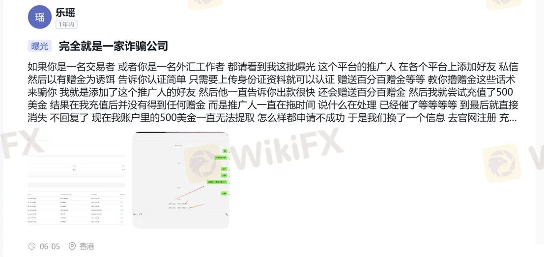 就在sjnkebz提款的前几天,外汇天眼上另一位用户乐瑶爆出更多细节,乐瑶称这个平台的推广人在各个平台上添加好友、私信,然后以有百分百赠金为诱饵,教你撸赠金,当受害者真正入金最后结局是既无赠金更无法出金。推广人直接消失,平台方均不回复。