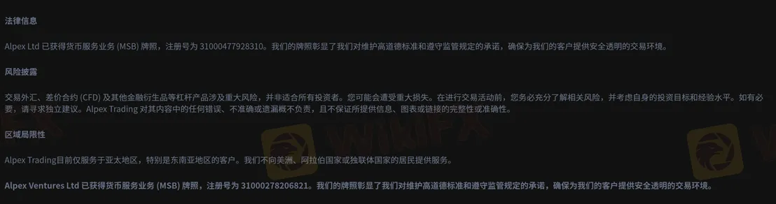 ALPEX TRADING网站宣称Alpex Ltd 已获得货币服务业务 (MSB) 牌照,注册号为 31000477928310;Alpex Ventures Ltd 已获得货币服务业务 (MSB) 牌照,注册号为 31000278206821。(如下图)