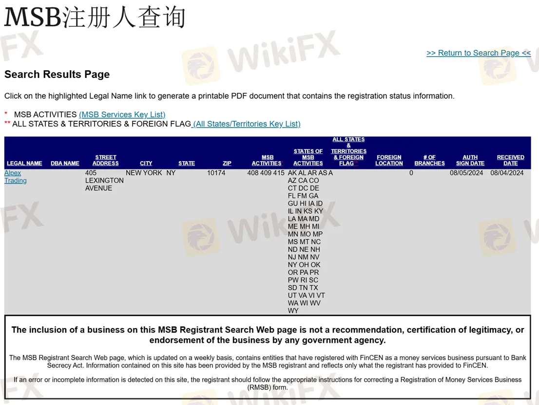 MSB注册号为31000278206821的法定名称(LEGAL NAME)为Alpex Trading,地址为405 Lexington Avenue, New York, NY 10174, MSB 活动代码:408、409、415,分别对应不同的货币服务业务类别(资金转移、货币兑换、预付卡相关服务)。