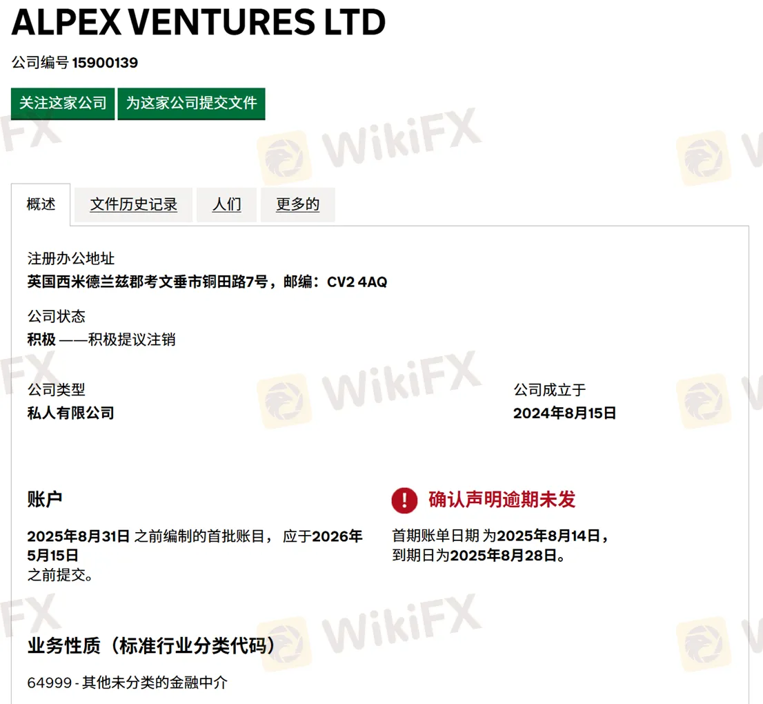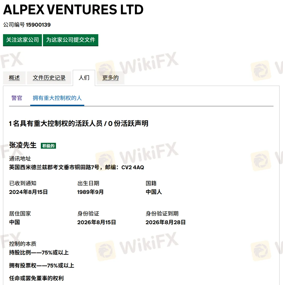MSB查询到的授权签署日期是2024年8月5日。8月15日有一家公司编为 15900139的ALPEX VENTURES LTD英国公司成立,目前公司状态显示【积极提议注销】,实控人中国籍(如下图)。MSB登记的主体和英国公司看似与Alpex Trading有关,但无法确认关联。另外一家同名称公司则直接出现在该平台的客户协议上。