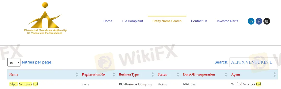 【客户协议】中提到的公司主体为Alpex Ventures Ltd,协议中明确该公司注册于圣文森特和格林纳丁斯(注册号:27117),注册地址:Suite 305, Griffith Corporate Centre, PO Box 1510, Beachmont, Kingstown, St. Vincent and the Grenadines。