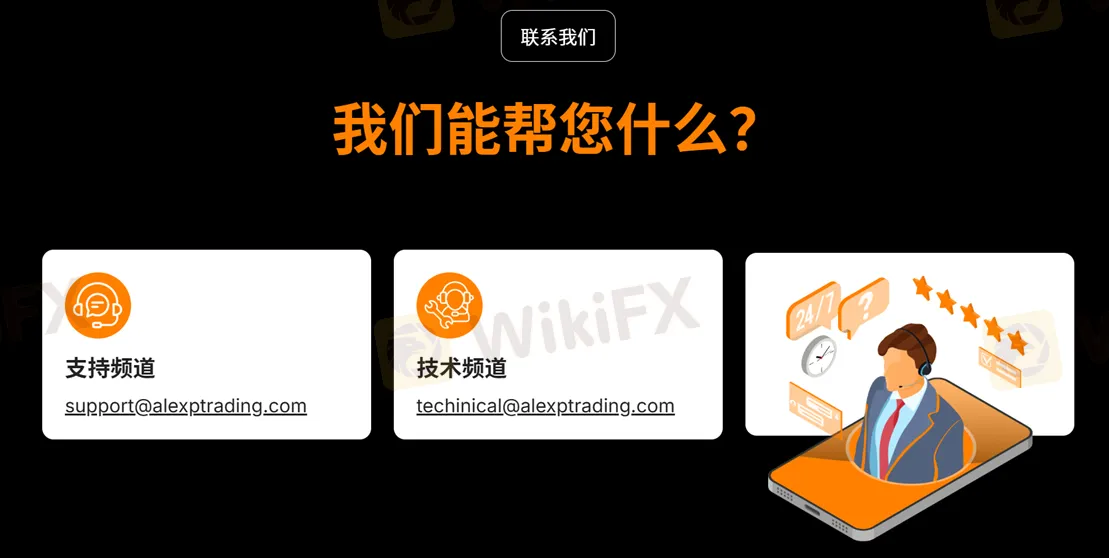 Alpex Trading 网站缺乏在线客服、电话和办公地址,只提供邮箱作为唯一联系方式。这种做法在金融市场中非常不利于投资者,在瞬息万变的交易环境下,投资者一旦遇到问题,很可能无法及时获得帮助。