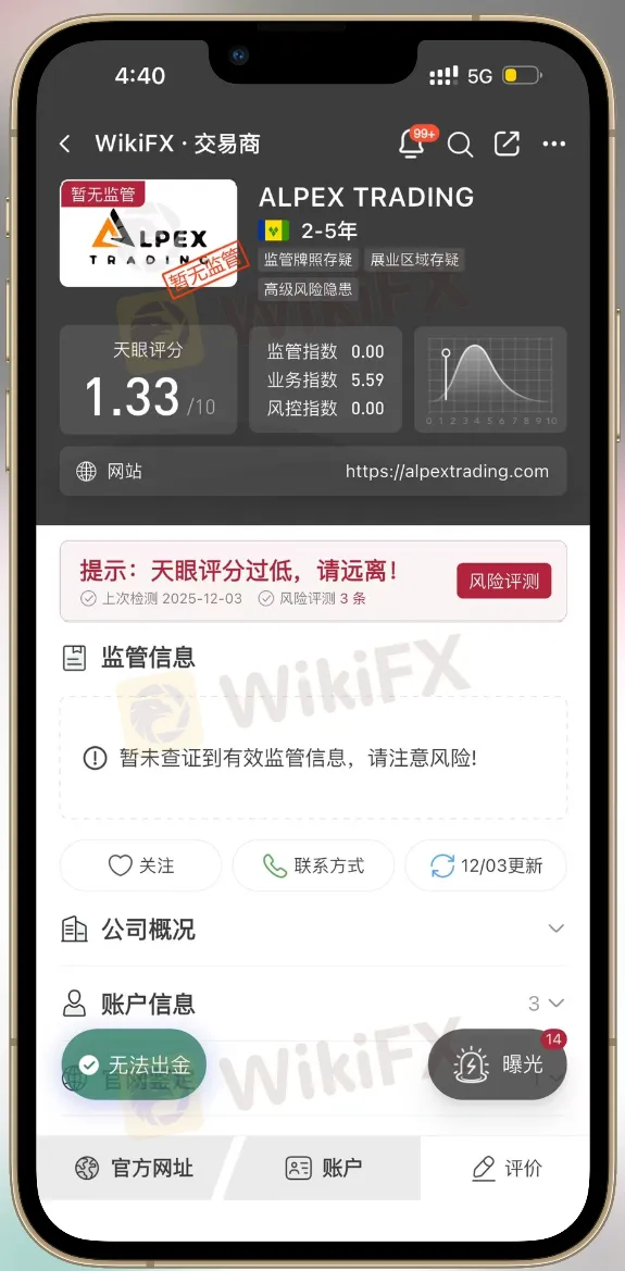 以一个投资者视角来看,Alpex Trading平台显然不适合投资。外汇天眼上该平台有多重风险警示:【监管牌照存疑】、【 展业区域存疑】、【高级风险隐患】、【该交易商无交易软件】,并提示:天眼评分过低,请远离!