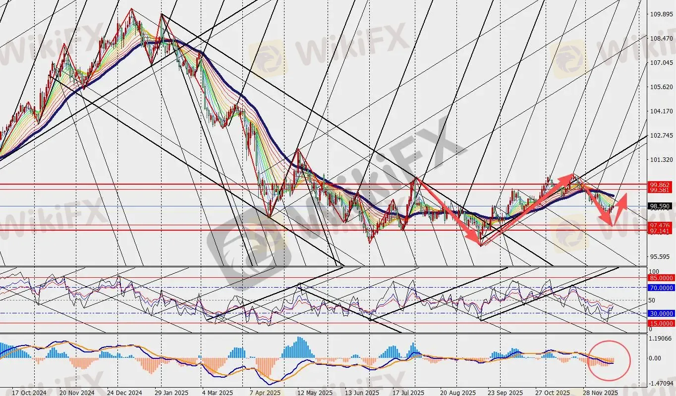 美元指数日线级别震荡反弹,MACD双线和量能柱在零轴附近不断收敛。尽管此次CPI数据有些不合理,但几位经济学家坚持认为通胀正在降温,只是可能没有周四的报告显示的那么多。