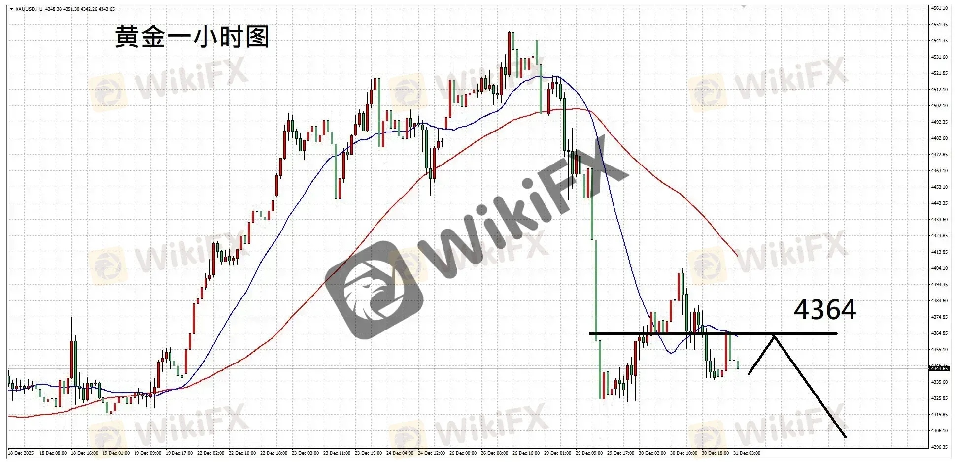 黄金一小时图,走势冲高后向下回落,均线维持下弯,显示短线卖压较强;如后续反弹未能突破阻力,则走势或向下修正,故建议短空操作。