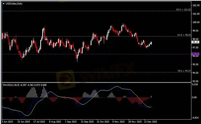 日线图显示美元指数震荡走强,当前仍承压于98.80阻力。从MACD来看,快慢线金叉依旧,白色动能柱温和放量。指数走势基本和动能柱的变化一致。