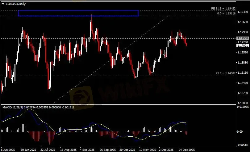 日线图显示欧元兑美元遇阻下挫,当前承压于1.1750阻力。从MACD来看,快慢线拐向下行,红色动能柱温和放量。汇价走势基本和动能柱的变化一致。