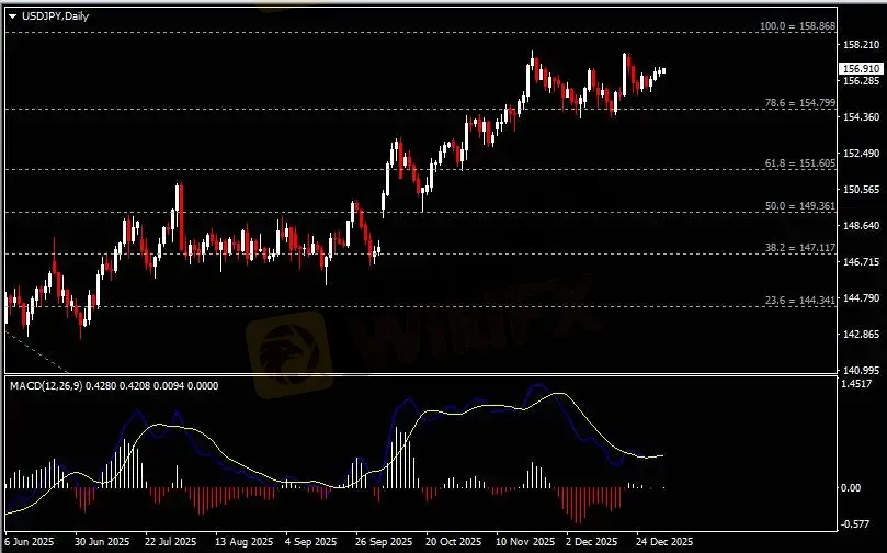 日线图显示美元兑日元波幅有限,当前仍收于154.80支撑。从MACD来看,快慢线向上运行,红色动能柱则显示汇价动能有限。汇价走势基本和动能柱的变化一致。