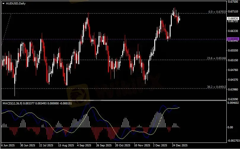 日线图显示澳元兑美元反弹上涨,当前回测0.67关键阻力。从MACD来看,快慢线形成死叉,白色动能柱收缩殆尽。汇价走势和动能柱的变化呈分歧。