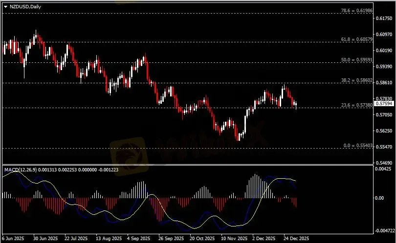 日线图显示纽元兑美元企稳收涨于0.5740支撑。从MACD来看,快慢线向下扩张,红色动能柱温和放量。汇价走势和动能柱的变化呈分歧。