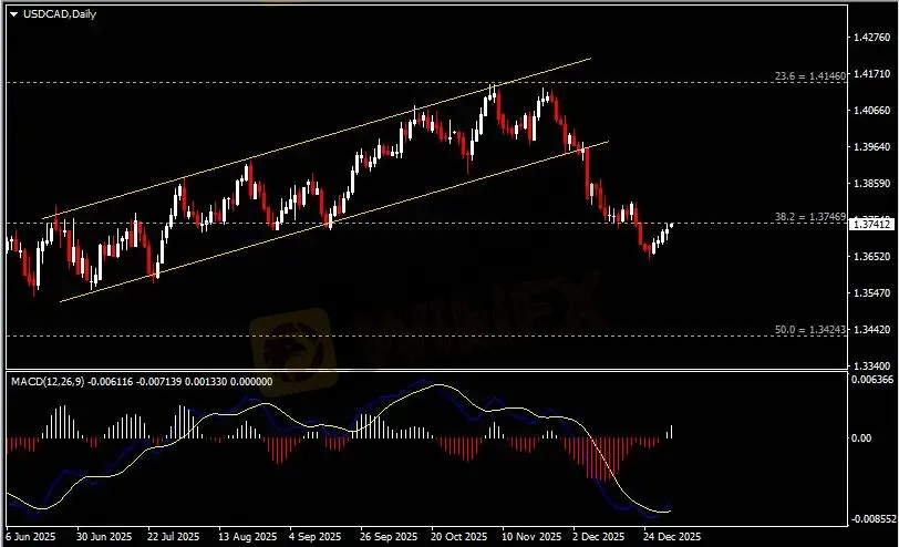 日线图显示美元兑加元反弹上行,当前逼近1.3750阻力。从MACD来看,快慢线金叉依旧,白色动能柱温和放量。汇价走势基本和动能柱的变化一致。