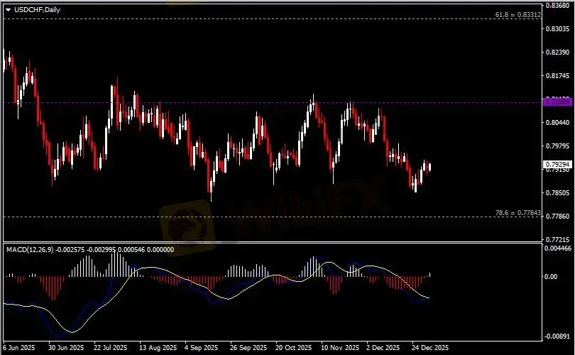 日线图显示美元兑瑞郎反弹暂缓,当前承压于0.81关键阻力。从MACD来看,快慢线金叉依旧,白色动能柱温和增量。汇价走势和动能柱的变化稍有分歧。