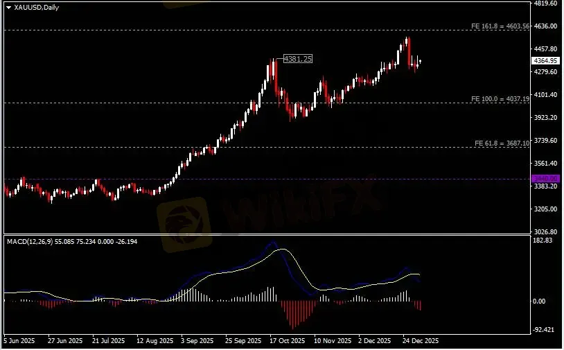 日线图显示金价于高位区间震荡,当前仍承压于4600关键阻力。从MACD来看,快慢线拐向下行,红色动能柱温和放量。金价走势和动能柱的变化呈分歧。