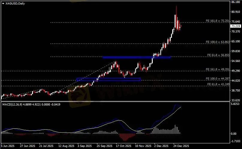 日线图显示银价回调暂缓,当前仍承压于75关键阻力。从MACD来看,快慢线欲形成死叉,白色动能柱收缩殆尽。银价走势和动能柱的变化呈分歧。