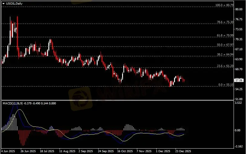 日线图显示油价于低位区间震荡,当前收于55关键支撑。从MACD来看,快慢线逐渐收窄,白色动能柱温和收缩。油价走势基本和动能柱的变化一致。