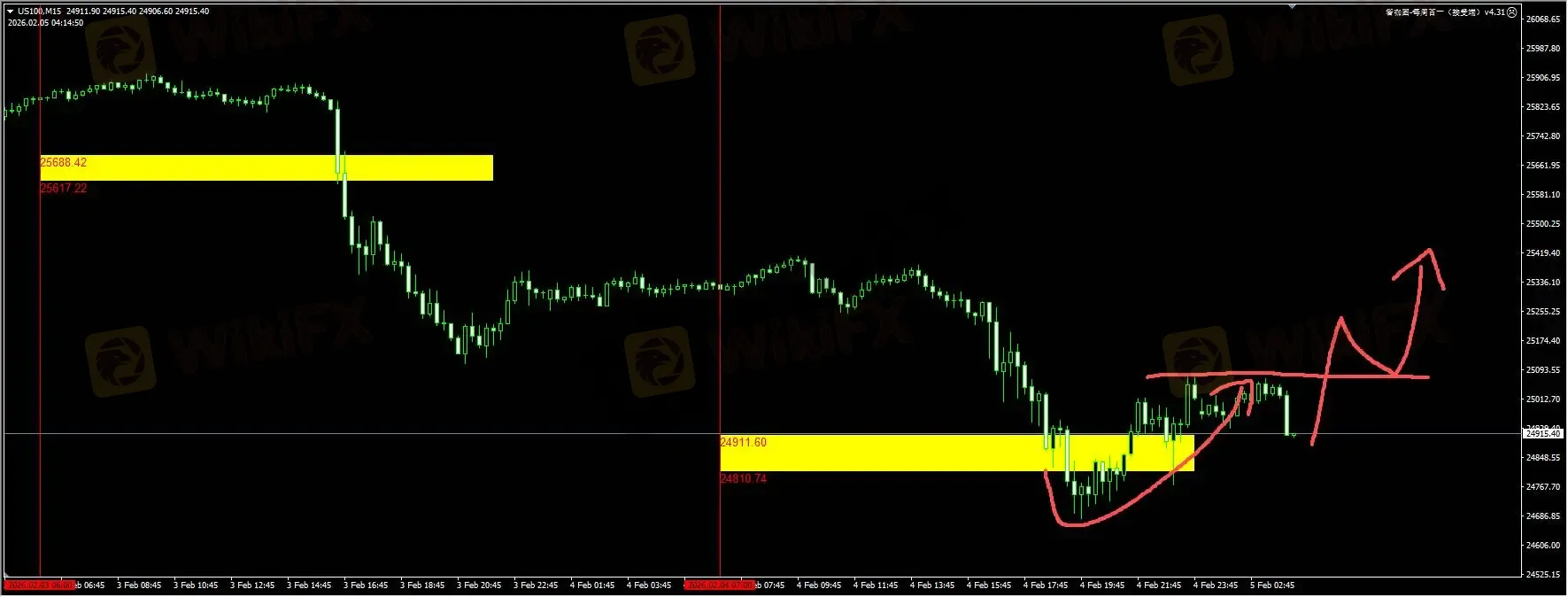 纳指:因AI叙事没有明显的开创性结果,反而侵蚀了软件公司业务,导致软件股大面积下跌。纳指隔夜如期下扫24900下方的流动性,目前价格暂时反弹。但日内建议想要继续抓反弹信号,需要等待25050-25100区域收复之后,等待回踩确认才买入。详细位置请咨询插件。