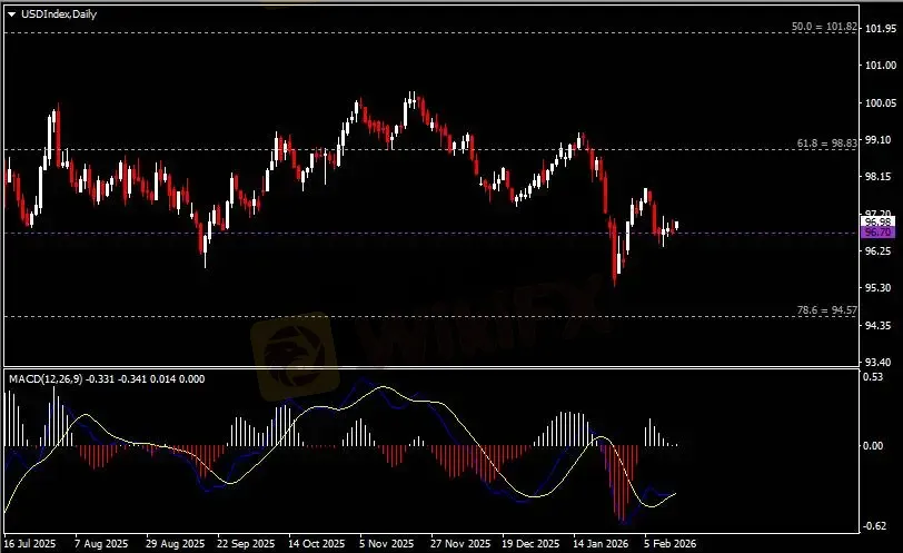 日线图显示美元指数小幅下挫,当前仍收于96.70支撑。从MACD来看,快慢线拐向上行,白色动能柱略恢复增量。指数走势和动能柱的变化呈分歧。