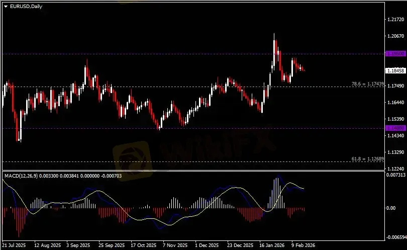 日线图显示欧元兑美元震荡下行,当前承压于1.1950阻力。从MACD来看,快慢线拐向下行,红色动能柱温和增量。汇价走势基本和动能柱的变化一致。